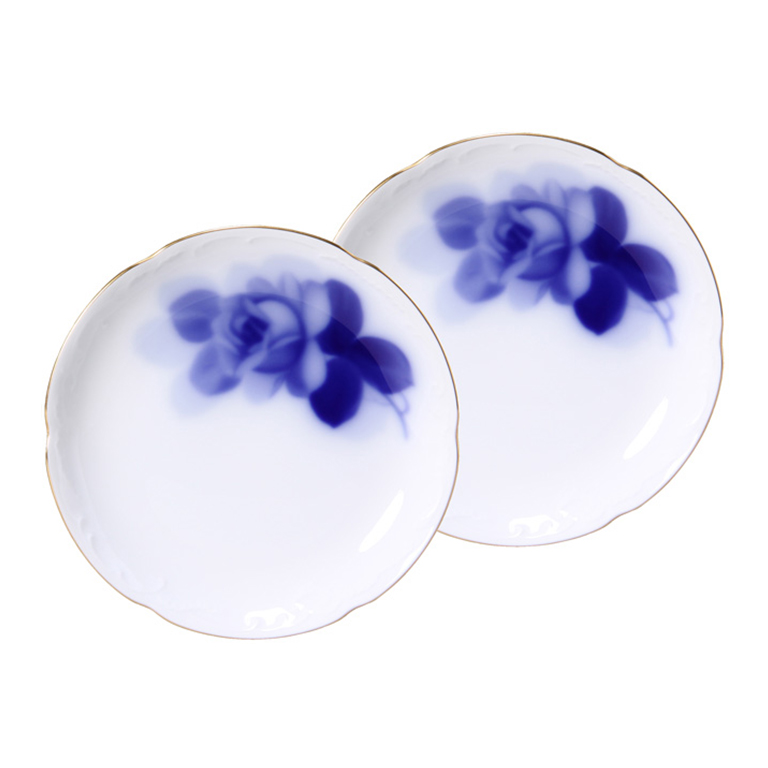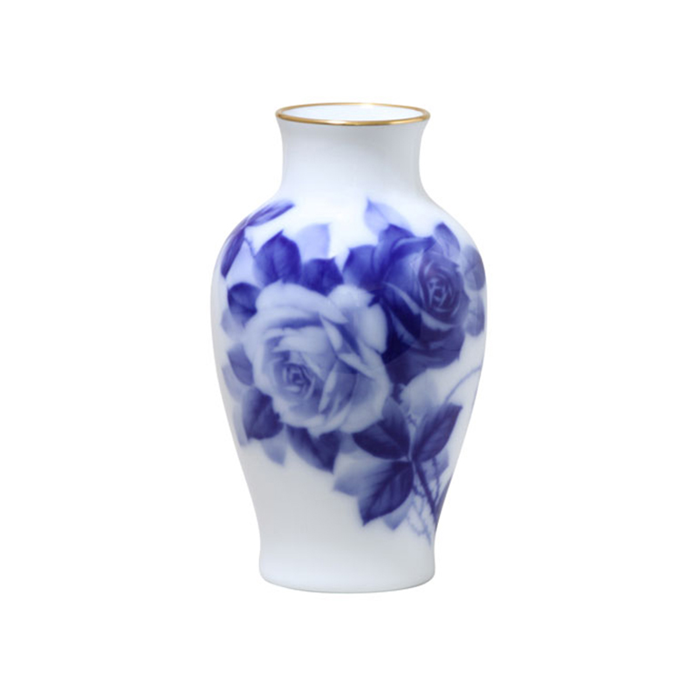 炎の芸術がつくり出す神秘の色彩「ブルーローズ」は、大倉陶園独特の“岡染め” という技法で表現しています。本焼成した白生地にコバルト絵具で絵付けをし、深みと優しさを加えながら美しい文様をつくりあげます。